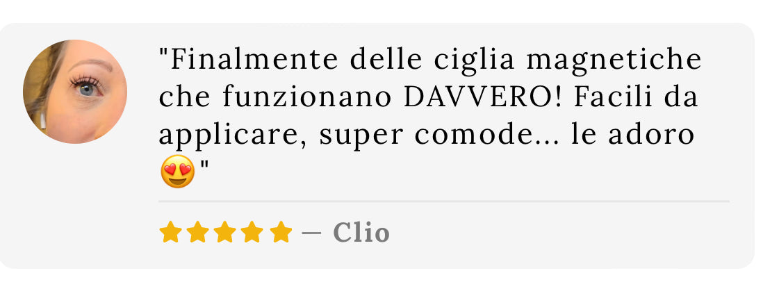 "Ogni mese spendevo più di 100€ tra refill e appuntamenti infiniti. La colla mi irritava gli occhi, le ciglia naturali si stavano rovinando. Poi ho scoperto queste ciglia magnetiche: in 10 secondi sono pronta, lo sguardo è pazzesco e finalmente mi sento LIBERA. Senza rinunce, senza compromessi."